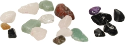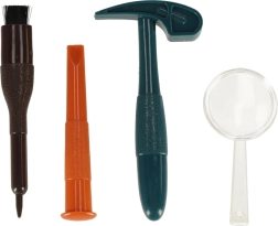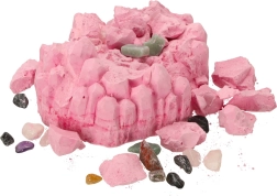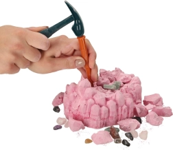 Dans le bloc en plâtre rose, vous trouverez 18 pierres authentiques. À l'aide du marteau et du burin, extrayez-les en toute sécurité, nettoyez-les au pinceau et observez-les à la loupe.
