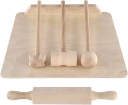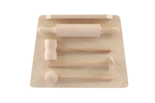 La planche, le rouleau et le maillet ressemblent à de véritables accessoires de cuisine. Ils favorisent le jeu d’imitation et le développement des compétences sociales.