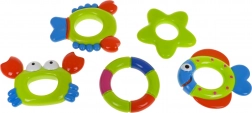 Le set comprend un crabe, un poisson, une écrevisse, une étoile et un anneau aux couleurs vives pour développer la reconnaissance des formes et des couleurs.