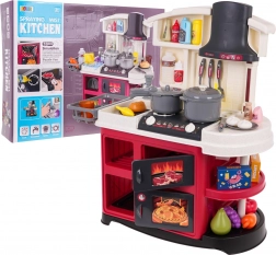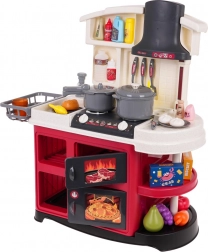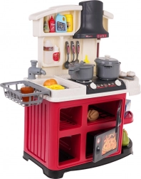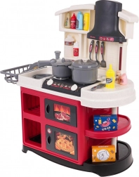 Un robinet fonctionnel avec eau courante est également inclus, afin que les enfants puissent “laver” la vaisselle comme dans une vraie cuisine. On trouve aussi un four ouvrant, un grill ouvrant, de nombreuses étagères de rangement et un riche assortiment d’accessoires comprenant casseroles, poêles, ustensiles et aliments factices.