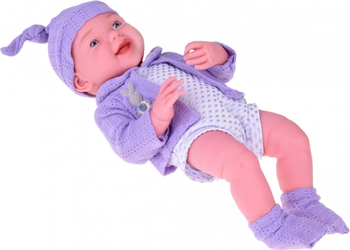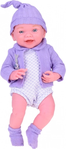 Poupée bébé souriante 40 cm avec petit cardigan violet