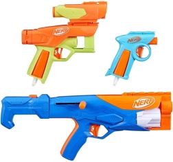 Le pack comprend trois blasters différents dans les couleurs principales bleu et orange, offrant différents styles de jeu.