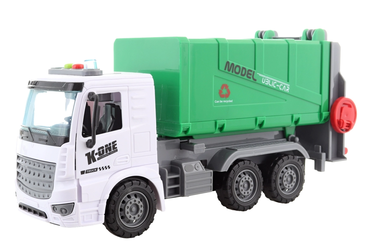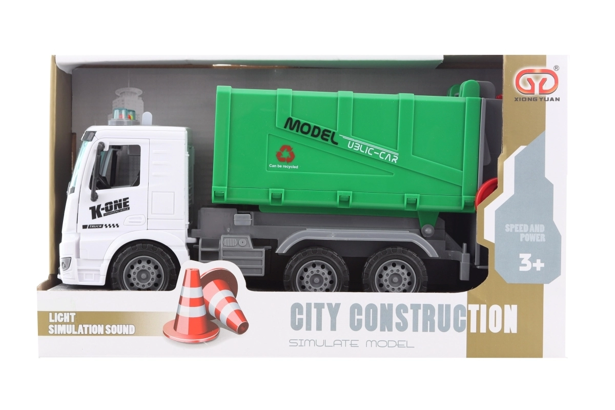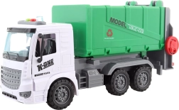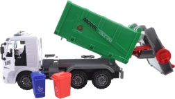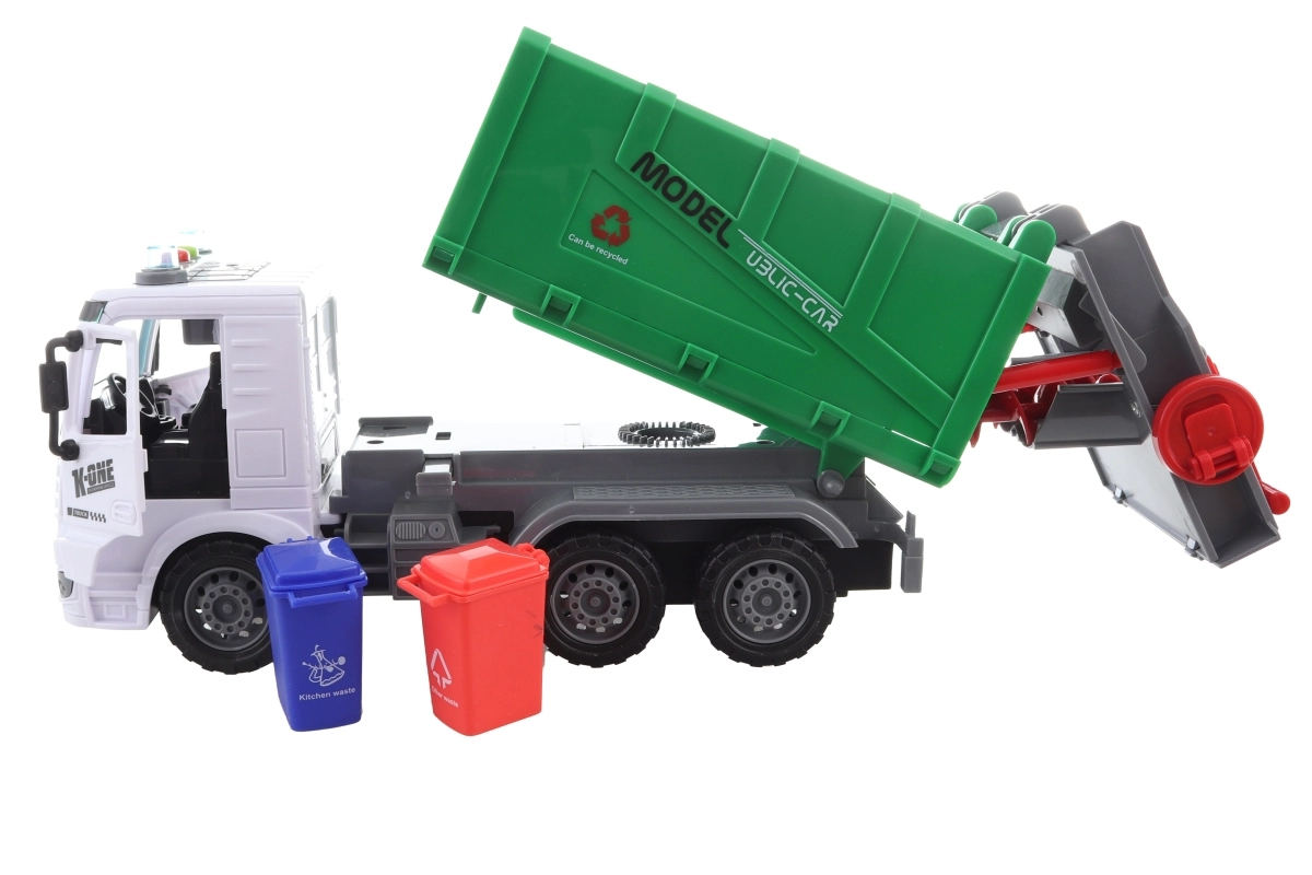 Camion benne en plastique à piles. Grâce à deux boutons situés sur la cabine, il émet des sons de conduite et de marche arrière. Contient 2 poubelles, qui peuvent être vidées à l’aide d’une manivelle. Piles 3x AG13 incluses. La partie arrière du conteneur à déchets peut être ouverte manuellement. Emballé en boîte. Dimensions de l’emballage env. 32 × 11,5 × 18,5 cm. Dimensions du camion env. 28 × 14 × 8,5 cm. Âge 3+