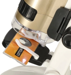 Le microscope est monté sur une base stable avec une lampe LED, qui assure un éclairage homogène. Grâce à ses deux niveaux d'agrandissement – 100x et 250x – il est possible d'observer la structure des fibres, des cellules et d'autres matériaux dans les moindres détails.