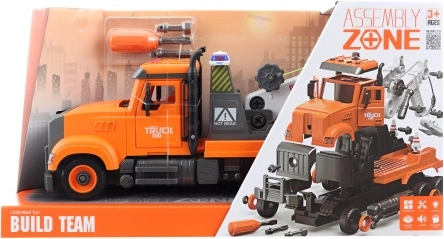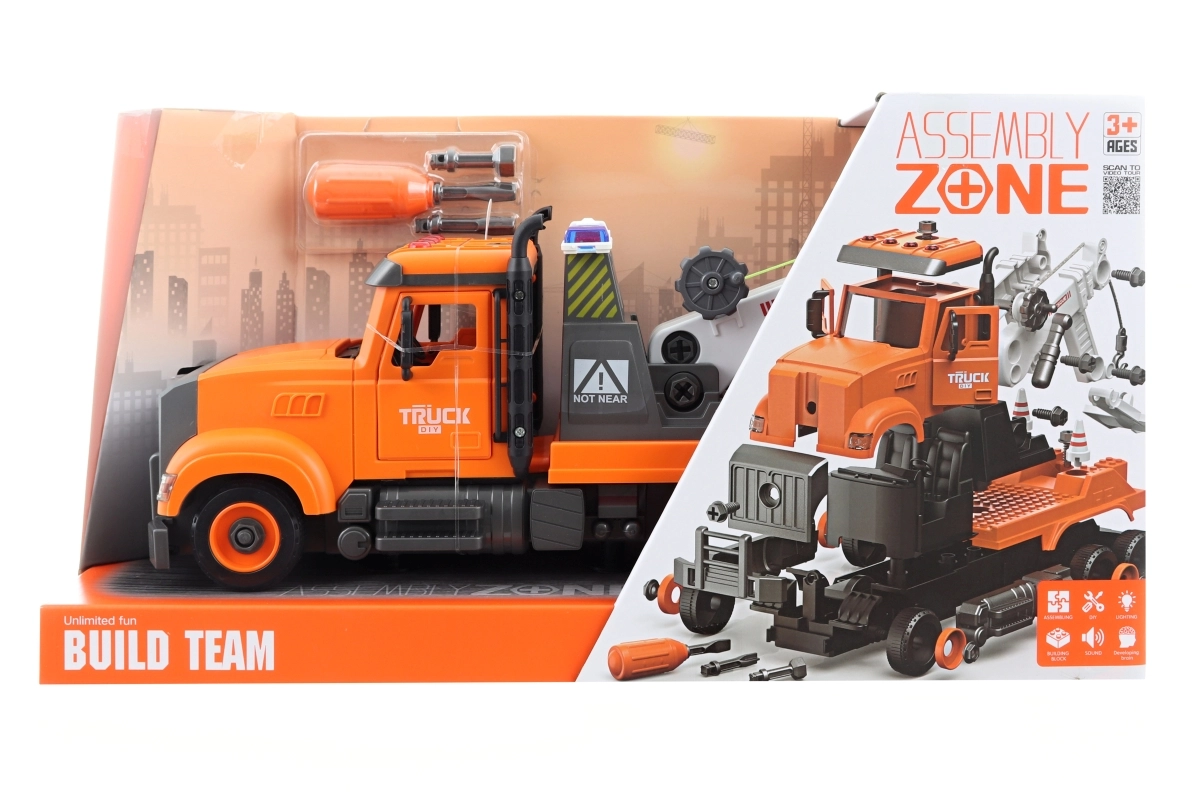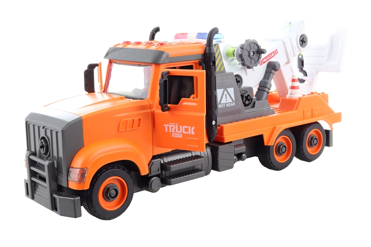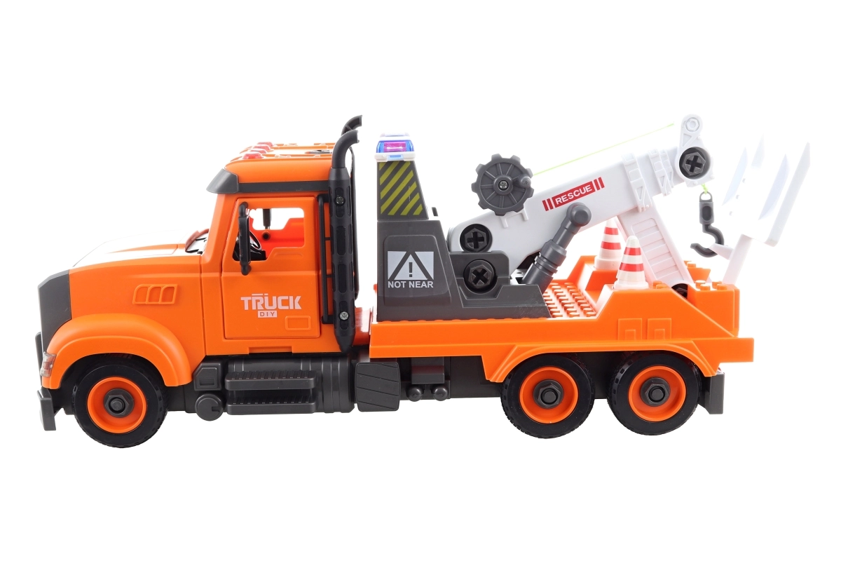 Belle grande dépanneuse à visser. Alimentée par 3 piles AG13 incluses. Sur le toit du véhicule se trouvent 4 boutons avec fonctions : démarrage, klaxon, bip de marche arrière et mélodie. Voiture à volant d’inertie. Matériau : plastique. Tournevis inclus. Emballage en boîte ouverte. Dimensions de l’emballage env. 41×22×13 cm. Dimensions de la voiture 36×15×11 cm. Âge 3+.