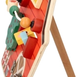 Le tableau comprend divers éléments interactifs comme des perles coulissantes et des pièces rotatives, qui favorisent le développement de la motricité.