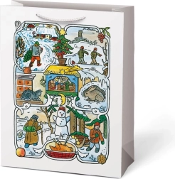 Élégant sac cadeau de Noël en papier, taille L, avec des illustrations uniques de Josef Lada, qui apporte à chaque cadeau la magie des traditions. Il possède une anse en corde robuste pour un port confortable, une étiquette pour dédicace et un vernis UV localisé de qualité pour une belle brillance et une meilleure résistance. Disponible en quatre motifs hivernaux et couleurs – blanc, rouge, bleu clair, bleu foncé – livré selon la disponibilité en stock.