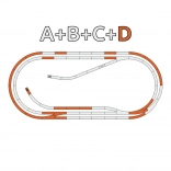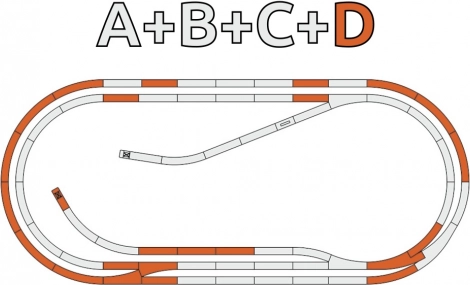 Rail droit G200 (3 pcs), Rail droit G185 (6 pcs), Rail droit G100 (1 pc), Rail courbe R3 (1 pc), Rail courbe R4 (10 pcs), Aiguillage simple gauche (2 pcs), Aiguillage courbe R3/4 gauche (1 pc), Butoir de voie avec 2 butées (1 pc), Bouchon de ballast (1 pc)
