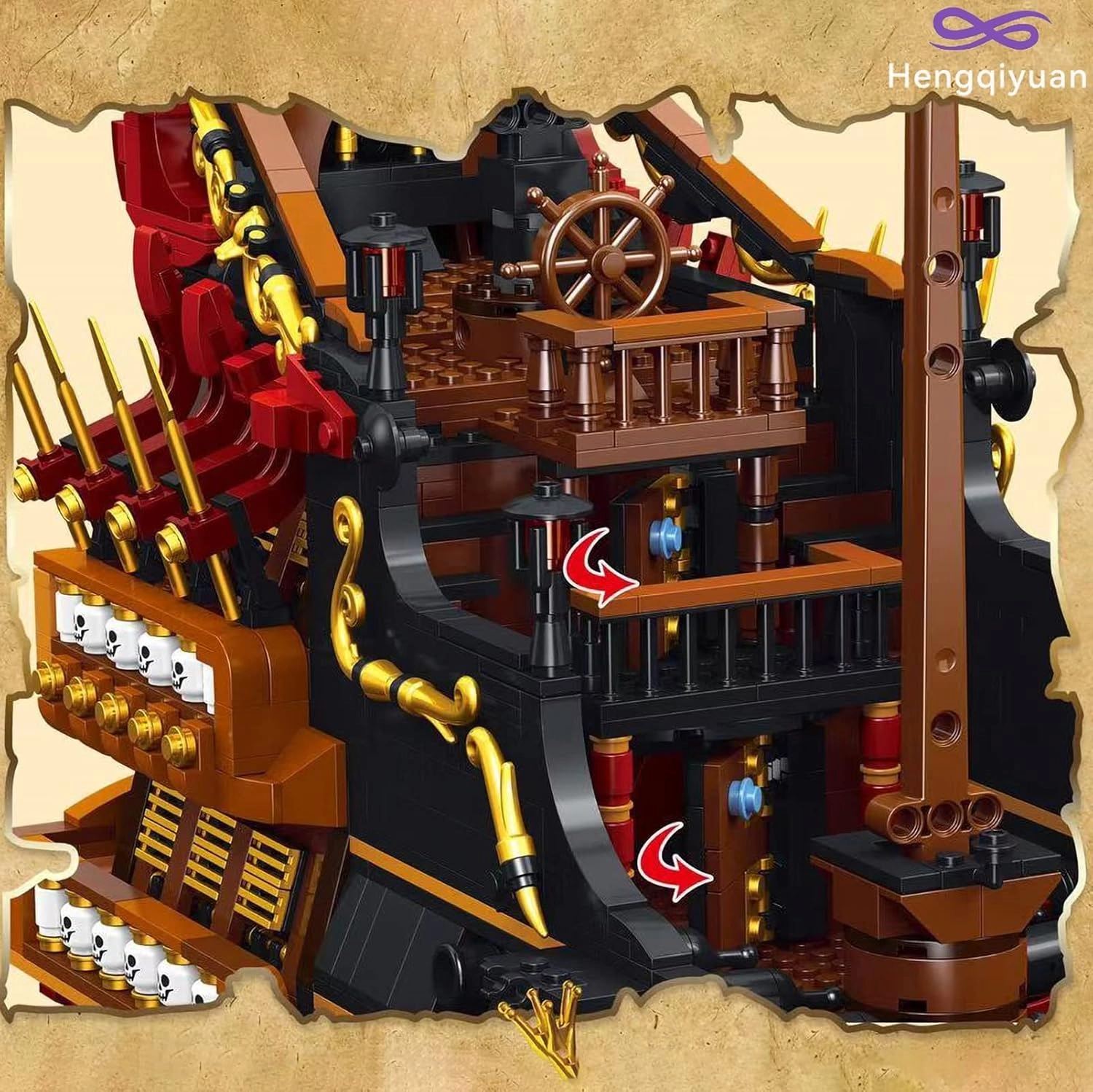 Le modèle est conçu pour une construction et un jeu fluides : coque et cabine facilement amovibles pour explorer l’intérieur du pont, ancre à commande manuelle et éléments ouvrants pour plus d’authenticité. L’assemblage solide des briques en plastique de qualité garantit la stabilité à l’exposition.