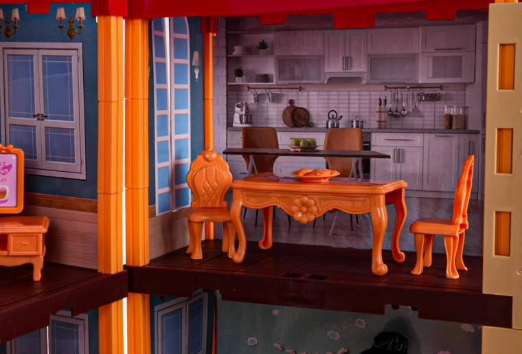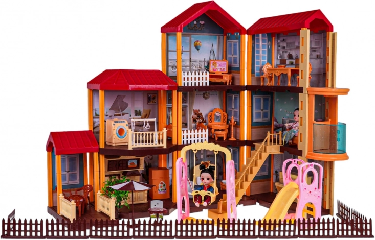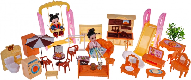 - Éléments de la maison et de la clôture, voiture, 2 poupées, 2 petits chiens, balançoire, toboggan, parasol, set de cuisine, piano droit, set de salle de bain, baignoire, lavabo avec miroir, table de cuisine, canapé, lit, réfrigérateur, coiffeuse, commode avec TV, portant avec cintres (3 pcs), machine à laver, patère, tabouret, 2× chaise, 3× chaise de jardin, 2× banc, table ronde, arbre, 5× lampe, poêle, 2× assiette de fruits de mer, 2× spatule, cuillère, notice de montage
