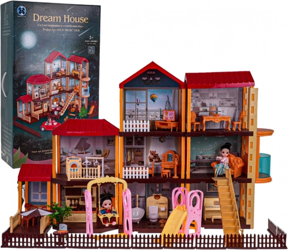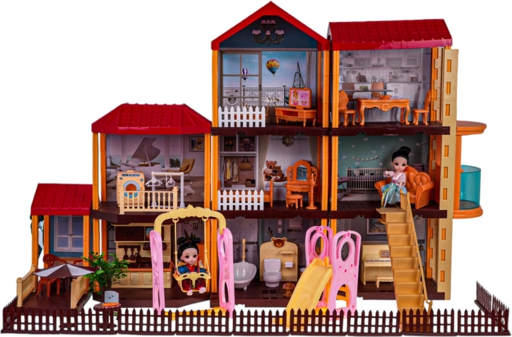 Cuisine, salle de bain, chambre, coin musical, mobilier, accessoires, 2 poupées, 2 petits chiens et divers éléments de jeu pour un amusement sans fin.