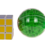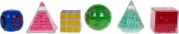 - toupie ovale avec casse-tête et cordon, cube de type RUBIK, cube avec labyrinthe 3D et bille, 2× pyramide avec labyrinthe et bille, casse-tête sphérique
