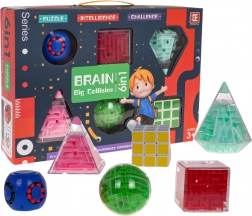 Un cube avec labyrinthe 3D, deux pyramides avec bille, un labyrinthe sphérique, une balle à billes et un cube de type RUBIK – des défis variés pour des heures de divertissement intelligent.