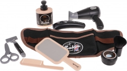 - Accessoires en 10 pièces pour un jeu réaliste : sèche-cheveux, rasoir électrique, rasoir/lame, ciseaux, peigne, miroir, blaireau, flacon avec pompe, boîte pour la mousse et ceinture à compartiments.