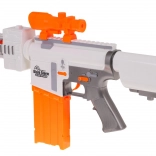 - Blaster, viseur réglable, chargeur, 20 fléchettes (10 à ventouse, 10 avec embout en caoutchouc)