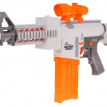 Le blaster est fabriqué en plastique de qualité et tient parfaitement en main. La portée de tir est d’environ 15 mètres, idéale pour les batailles à la maison comme en plein air. L’alimentation est assurée par 5× AA 1,5 V (piles non incluses).
