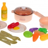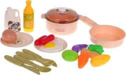 Le set de 28 pièces comprend une casserole avec couvercle, une poêle, des assiettes, des couverts et un large choix d’aliments. Les enfants peuvent préparer des petits-déjeuners, déjeuners et dîners selon leur imagination.
