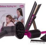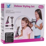 Ensemble de coiffeur idéal pour les enfants qui souhaitent devenir de petits coiffeurs. Set richement équipé comprenant un sèche-cheveux avec embouts interchangeables, un fer à lisser, un peigne et une brosse. Le sèche-cheveux fonctionne avec deux piles AA (non incluses) et émet des sons comme un véritable appareil. Le fer à lisser s'allume et émet des sons typiques.
