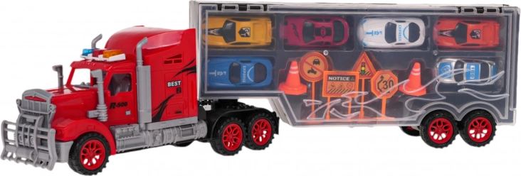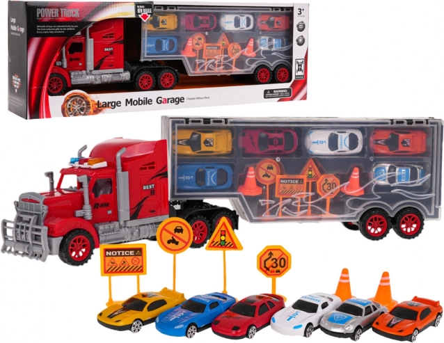 - Camion avec remorque, 6 petites voitures, 4 panneaux de signalisation, 2 cônes