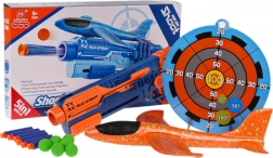 - pistolet, 6 fléchettes en mousse à ventouse, 6 balles en mousse, cible, avion en mousse