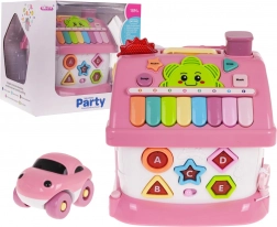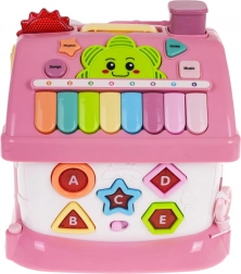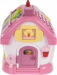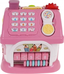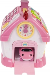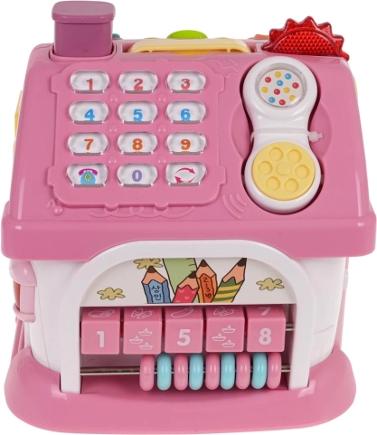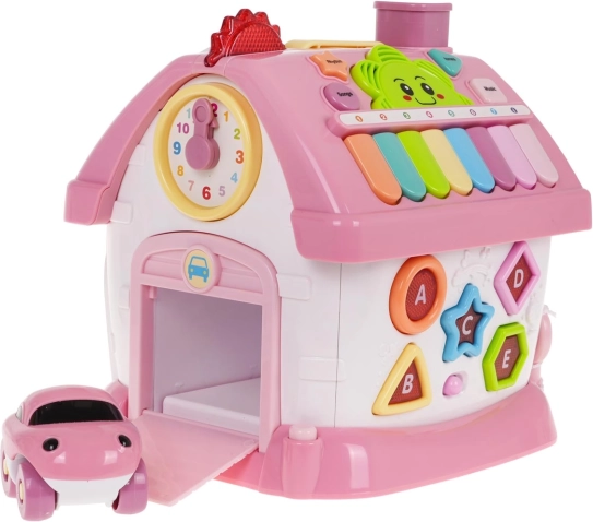 Le toit abrite un téléphone amovible, un clavier numérique et un piano à huit touches colorées sur lequel les enfants peuvent jouer des mélodies et changer tons et rythmes. La façade propose une porte ouvrante avec son de sonnette et petite lumière; les parois latérales, l’alphabet A–E avec prononciation en anglais et noms des formes, des éléments rotatifs et un garage avec petite voiture rose coulissante.