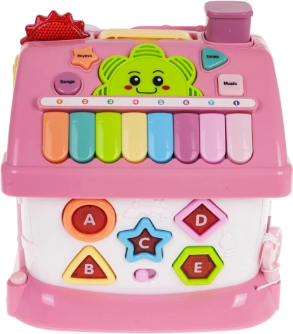 Maison interactive colorée pour enfants dès 18 mois, favorisant l’apprentissage par le jeu. Elle offre des effets lumineux et sonores, un piano à 8 touches, un téléphone, une horloge avec aiguilles mobiles, un tri des formes et des lettres A–E, des portes et un garage ouvrants et une poignée pratique pour un transport facile. Inclus également: une petite voiture pour encore plus de plaisir.