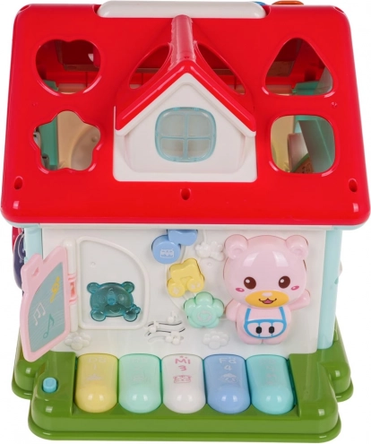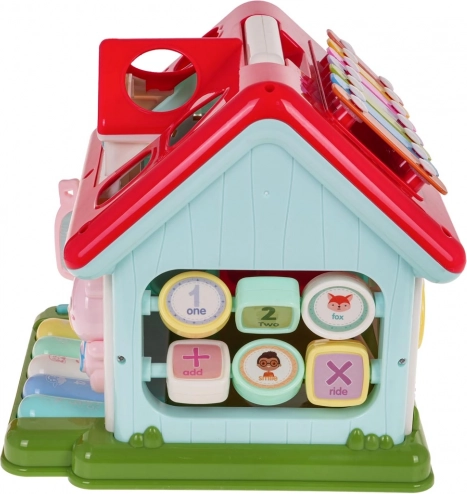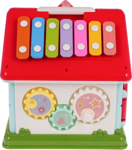 Découvrez une façon ludique de familiariser les enfants avec la musique, les formes et les couleurs. La maisonnette interactive combine un petit piano à 5 touches (chiffres, animaux et leurs sons, mélodies, notes Do–Sol), une lucarne lumineuse et des éléments parlants/joueurs avec des animaux. Chaque face propose une activité différente — de la porte à clé aux roues dentées et blocs rotatifs avec lettres.