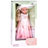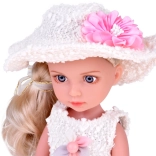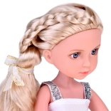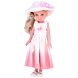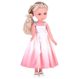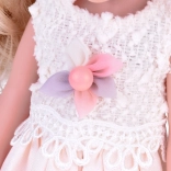 Cette poupée a de longs cheveux blonds tressés en une tresse élégante et est vêtue d'une ravissante robe cocktail dans des tons de rose avec des bretelles argentées. Elle est ornée d'une fleur délicate et porte un boléro crème. Sur sa tête, un chapeau crème stylé qui lui donne charme et élégance, et aux pieds, des chaussons blancs. Elle a l'air tout simplement adorable!