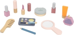 Le miroir, la palette de fards, les vernis, les rouges à lèvres, le parfum et le peigne sont en bois et servent d’imitations de cosmétiques – idéals pour un maquillage sûr et fantaisiste.