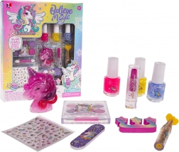 - rouge à lèvres, applicateur à paillettes, lime à motif licorne, séparateur de doigts, autocollants pour ongles