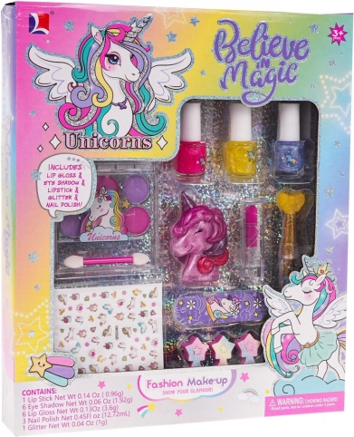 Contenu de l’emballage : 3× vernis à ongles pailleté, rouge à lèvres, applicateur à paillettes, lime à ongles avec licorne, séparateur de doigts, palette de fards à paupières (6 couleurs) avec pinceau, gloss à lèvres dans une boîte en forme de licorne, autocollants décoratifs pour ongles.