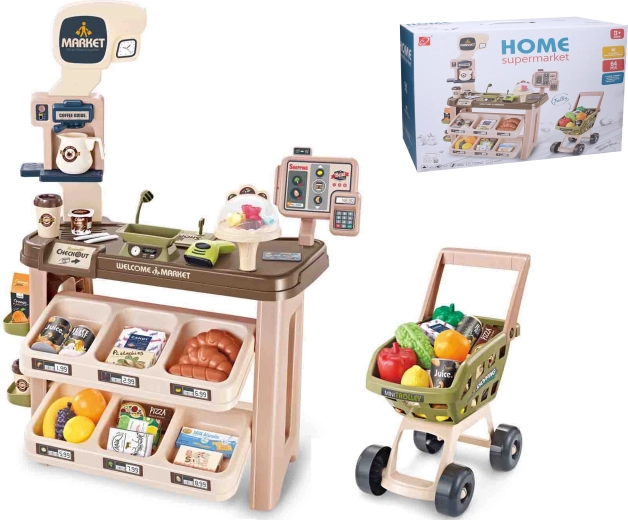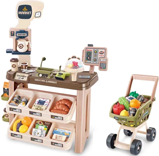 Le set comprend de nombreux accessoires : caisse enregistreuse, lecteur de codes-barres, terminal de paiement, carte de paiement, billets, pièces et chariot de courses. Sont également inclus fruits, légumes, lait, café, jus, biscuits, pizza, noix et d’autres aliments pour un jeu réaliste. Les éléments électroniques se commandent facilement via l’interrupteur ON/OFF situé sur la face inférieure du terminal de paiement.