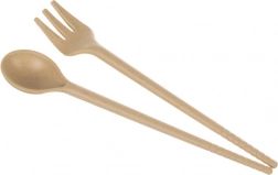 Un ensemble de couverts écologiques est inclus, comprenant une cuillère et une fourchette avec un bord ondulé.