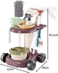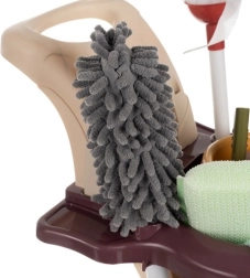 Quatre larges roues, deux étagères spacieuses et des crochets et ouvertures pratiques pour ranger les accessoires. Les enfants transportent facilement seau, serpillière, raclette et pulvérisateur et gardent tout bien organisé au même endroit.