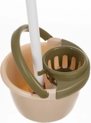 Un agencement astucieux permet d’avoir toujours tous les accessoires à portée de main : en bas, le seau avec essoreur pour la serpillière, en haut, le bol, le pulvérisateur et la raclette à eau. Des ouvertures et crochets spéciaux maintiennent la serpillière, le plumeau et les chiffons, tandis que le support stable accueille clairement le balai, la balayette et les pelles. Le jeu de ménage développe ainsi la responsabilité, la motricité fine et le sens de l’ordre.
