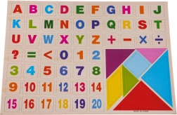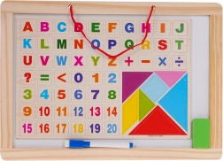 - Tableau double face, feutre effaçable à sec, craie, éponge, 54 magnets avec lettres et chiffres, 7 formes géométriques, notice illustrée