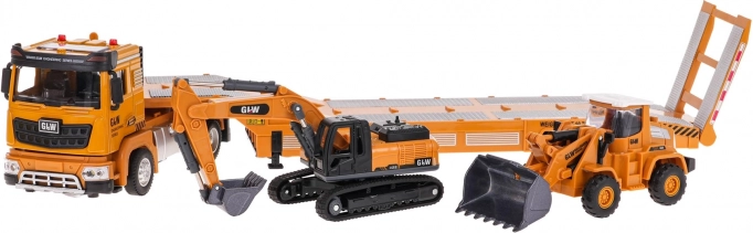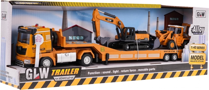 Véhicules de construction interactifs avec remorque pour les enfants à partir de 3 ans, combinant métal et plastique pour une résistance maximale. Le véhicule composé d'un tracteur, d'une pelleteuse et d'un chargeur offre des effets lumineux et sonores, contribuant à un jeu réaliste.