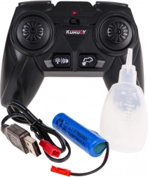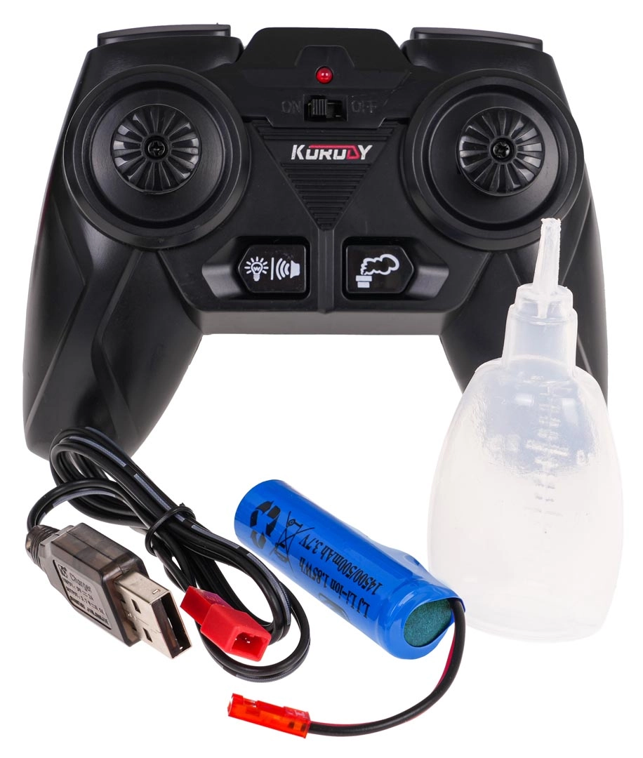La télécommande 2,4 GHz permet un pilotage fluide en avant, en arrière, à droite et à gauche sans interférences. La batterie rechargeable 3,7 V 500 mAh intégrée offre suffisamment d’énergie pour jouer, la recharge s’effectue via USB. L’effet de fumée s’active à l’aide du flacon d’eau fourni pour une expérience encore plus réaliste.