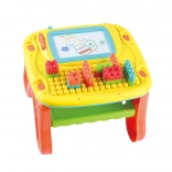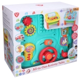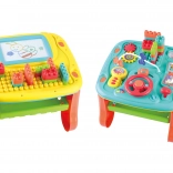 La table d’activités double face 37 cm combine amusement et apprentissage en un seul produit. La face supérieure avec volant, levier de vitesse et hochets développe la motricité fine et les perceptions sensorielles, tandis que la face inférieure avec ardoise magnétique et base pour blocs stimule la créativité et l’imagination.