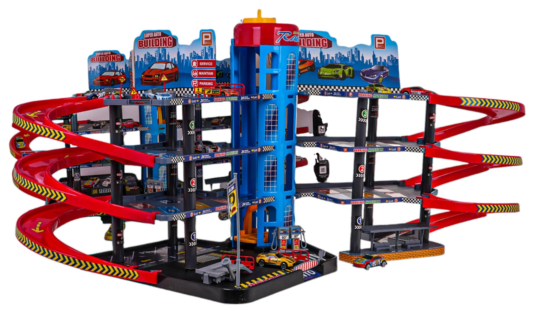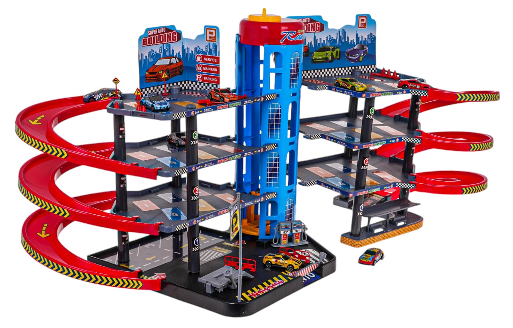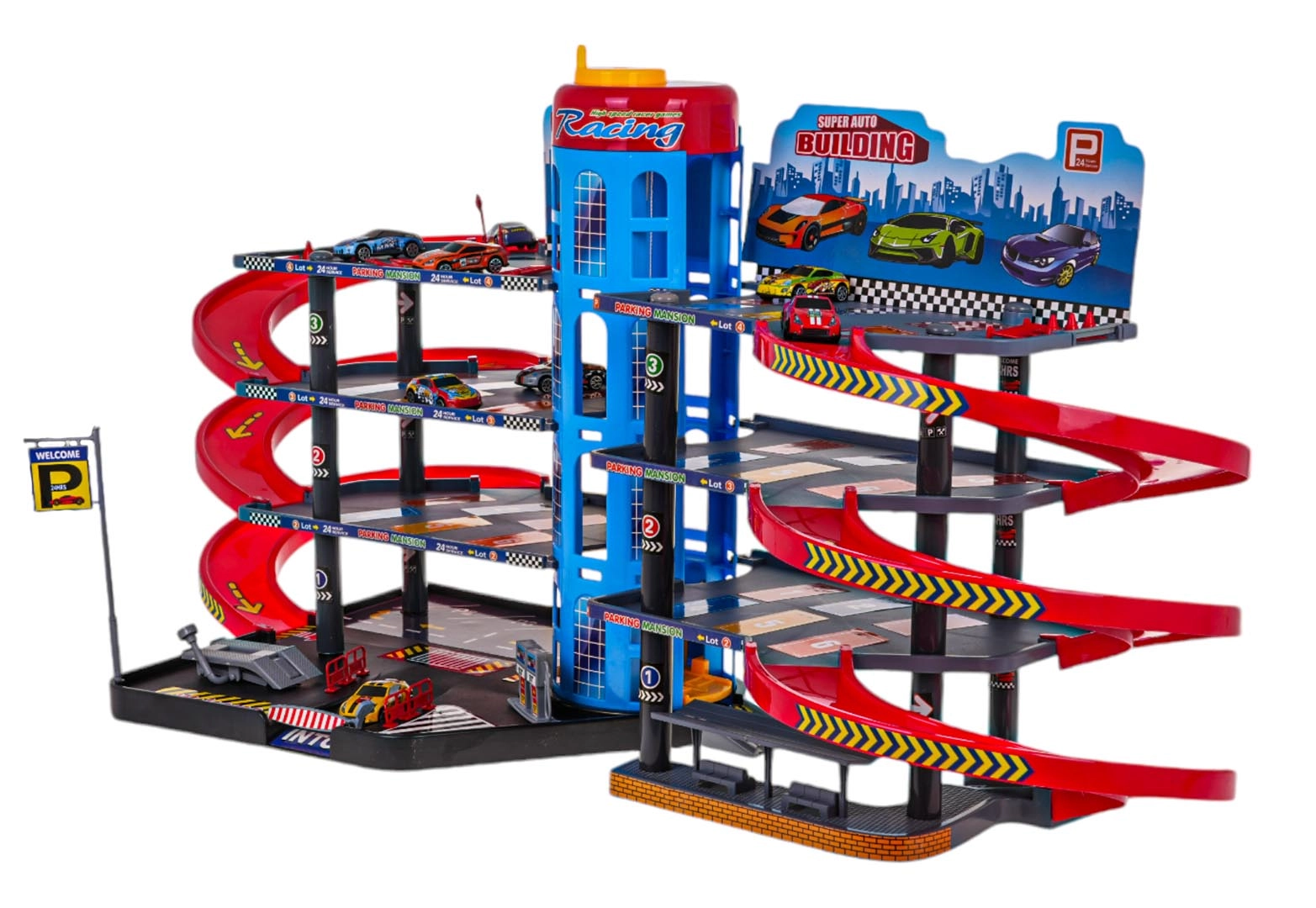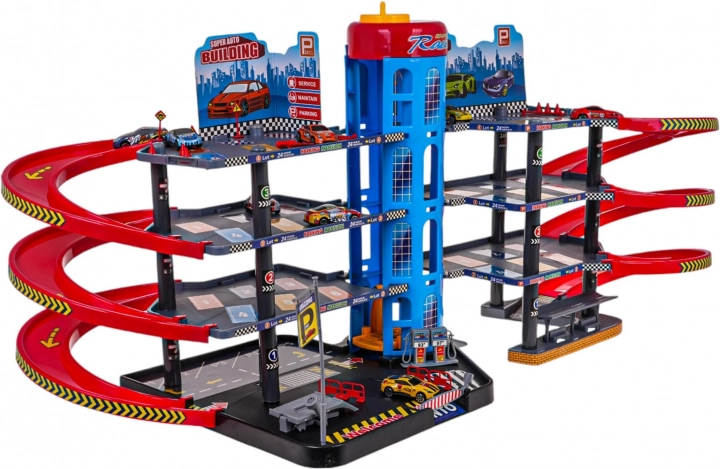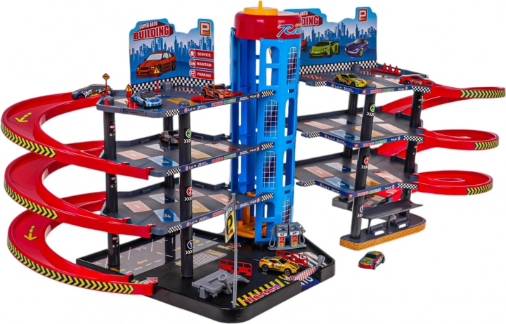 Plusieurs niveaux avec des rampes spirales rouges et des places de stationnement favorisent un jeu dynamique, des courses palpitantes et des manœuvres de stationnement précises.