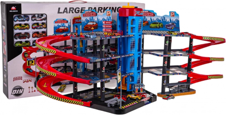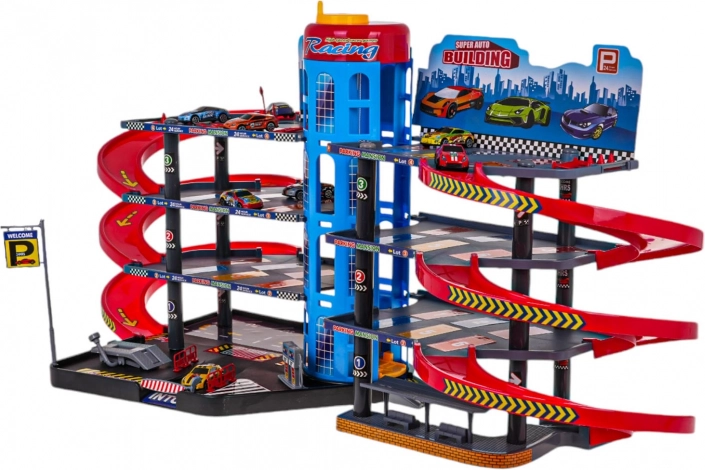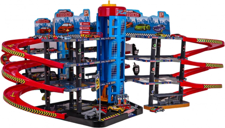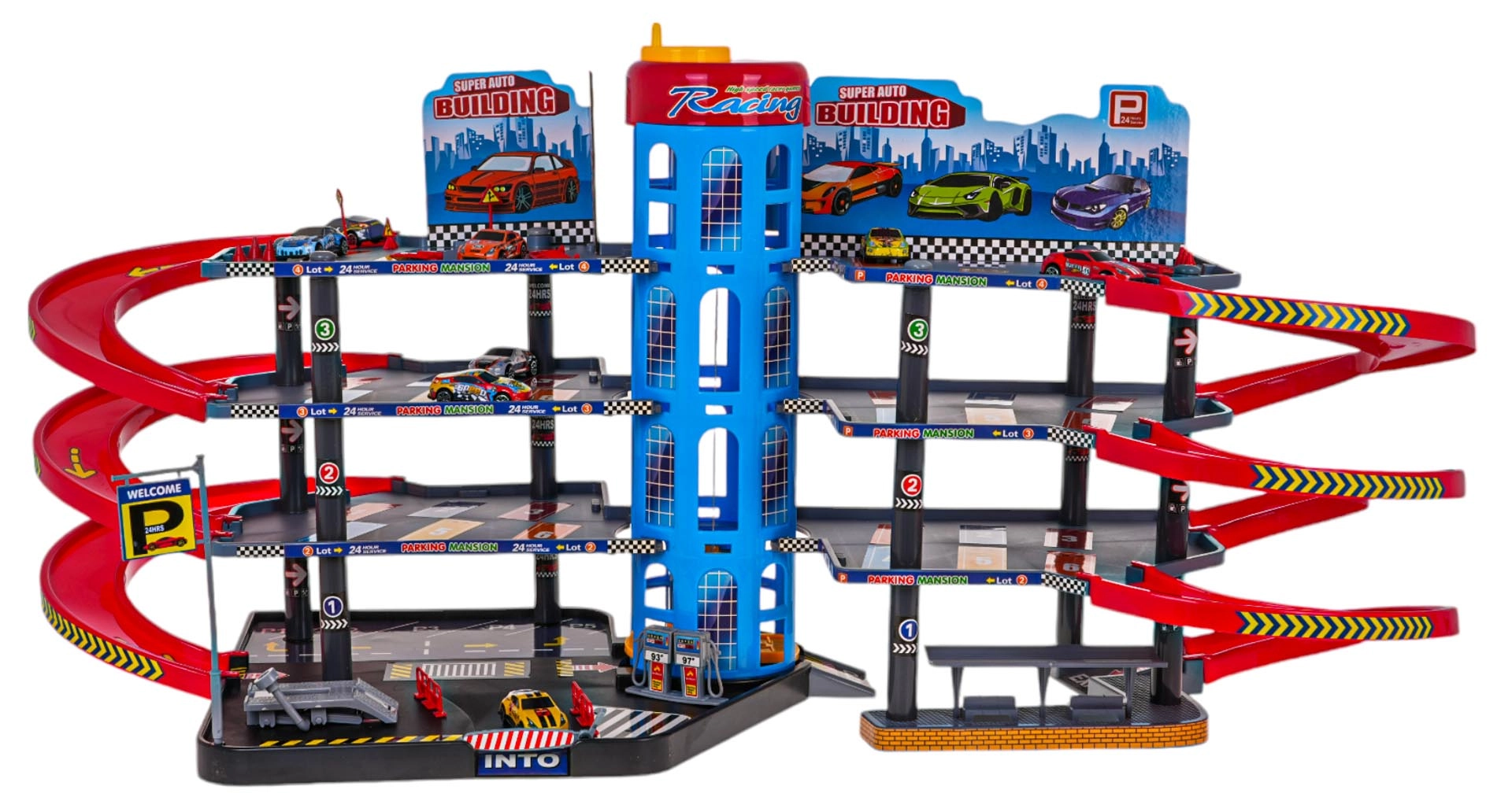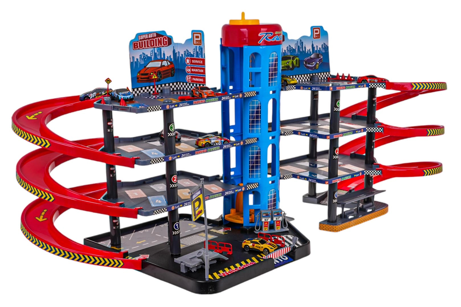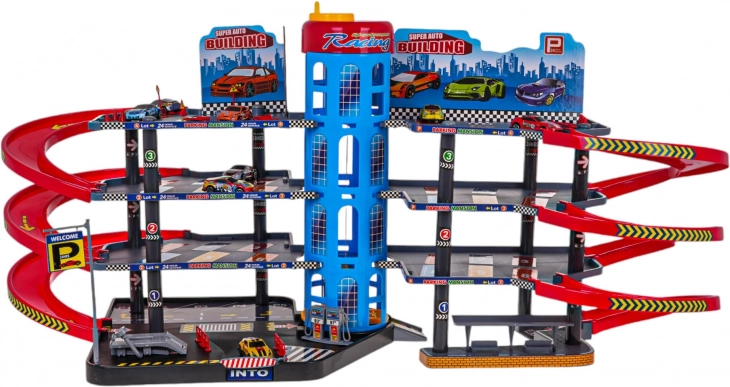 Plusieurs niveaux avec des rampes spirales rouges et des places de stationnement favorisent un jeu dynamique, des courses palpitantes et des manœuvres de stationnement précises.