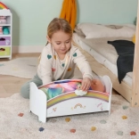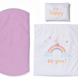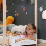 Un petit oreiller moelleux, une couette et un matelas de base avec des inscriptions joyeuses et des motifs arc‑en‑ciel permettent de changer le look du lit selon l’humeur.