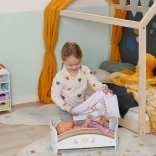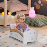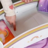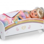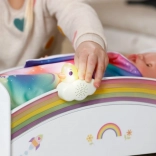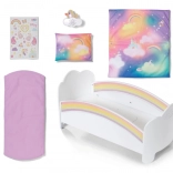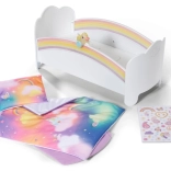 Adorable lit arc‑en‑ciel pour poupées BABY born qui transforme le coucher en rituel magique. Il propose une veilleuse lumineuse avec berceuse, une literie réversible et un design à personnaliser avec des autocollants. Sans oublier la cachette secrète sous le matelas pour les petits trésors.