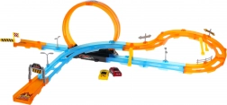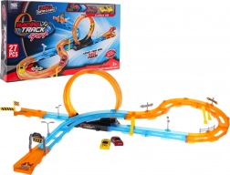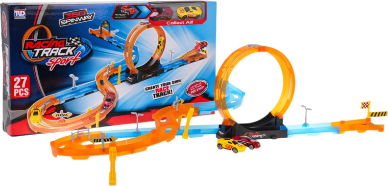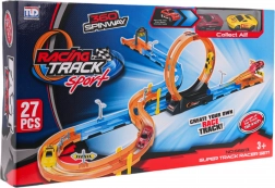 Grande piste de course avec des virages serrés, des loopings et deux petites voitures incluses, idéale pour les enfants à partir de 3 ans. Comprend 27 pièces à assembler soi-même.