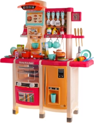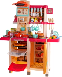 Cette cuisine de qualité aux couleurs vives stimule l’imagination et le jeu de rôle. La plaque de cuisson interactive déclenche, en tournant les boutons, des sons de cuisson et de friture accompagnés d’un rétroéclairage des brûleurs. Du robinet, l’eau coule réellement, afin que les enfants puissent “laver” la vaisselle comme dans une vraie cuisine.
