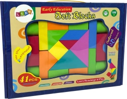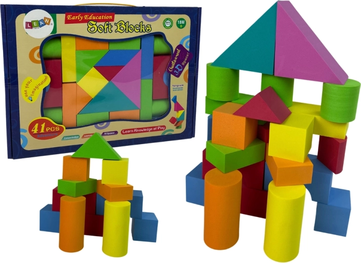 Le set comprend 41 pièces de plusieurs formes (ronds, demi-cercles, rectangles, carrés) et dimensions, ce qui permet de combiner facilement et de développer la représentation spatiale. Convient au jeu individuel comme aux constructions en famille.