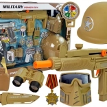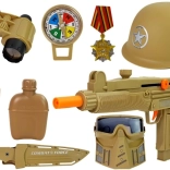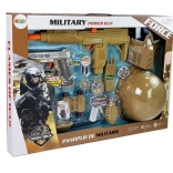 Grand set militaire pour petits aventuriers offrant des heures de jeu créatif. Comprend un casque, un masque, deux pistolets avec effets lumineux et bruit de tir, une grenade, une lorgnette, une boussole, un couteau et d’autres accessoires. Le tout est fabriqué en plastique résistant et dans une couleur militaire unie. Idéal pour les déguisements, le jeu en groupe et comme cadeau – emballé dans une boîte cadeau. Alimentation des pistolets : 3× AG13 (incluses). Convient à partir de 3 ans, CE, EN 71.