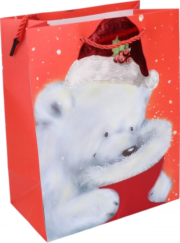 Sac cadeau de Noël élégant en taille M pour un emballage de cadeaux pratique et chic. Idéal pour les cadeaux de taille moyenne, avec des poignées solides et une impression de haute qualité. Dimensions pratiques, motif de Noël et fabrication durable pour une réutilisation multiple.
