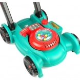La tondeuse jouet avec poignée rotative et billes multicolores simule de manière ludique une vraie tondeuse.
