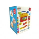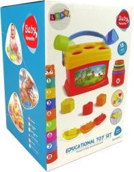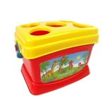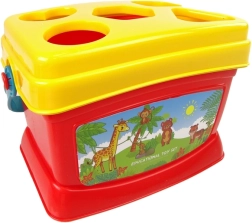Le seau avec couvercle fait office de trieur de formes avec motifs d’animaux, permettant un jeu interactif et l’apprentissage des formes et des couleurs.
